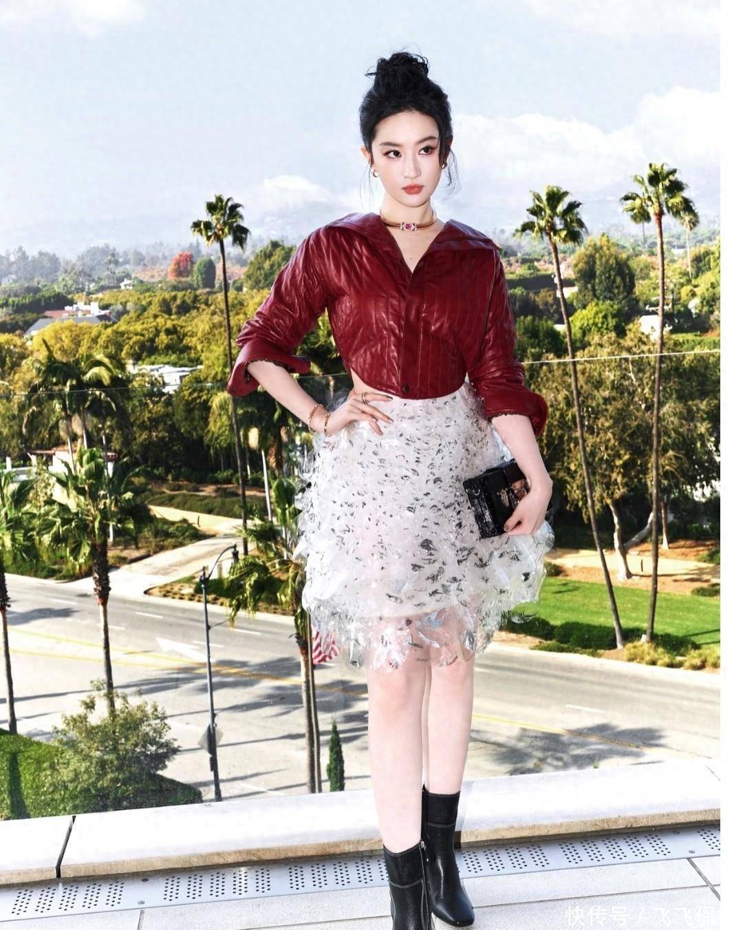 刘亦菲身着朱红色上衣搭配白色亮片短裙,整体造型时尚感十足。这套被媒体称为“木兰红”的服装来自Louis Vuitton特别定制,意在致敬她曾饰演的花木兰角色。